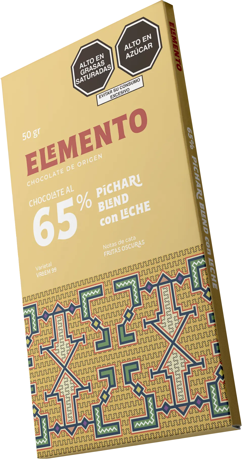 Origen: Pichari, Perú. 65% de cacao; endulzante: azúcar de caña. Presentación: 50 g neto / 88 g bruto. Medidas del empaque: 16 cm x 9 cm x 0.6 cm. Notas de cata: frutas oscuras, toffee, caramelo. Ingredientes: cacao, leche, manteca de cacao, azúcar. Usos: consumo directo.