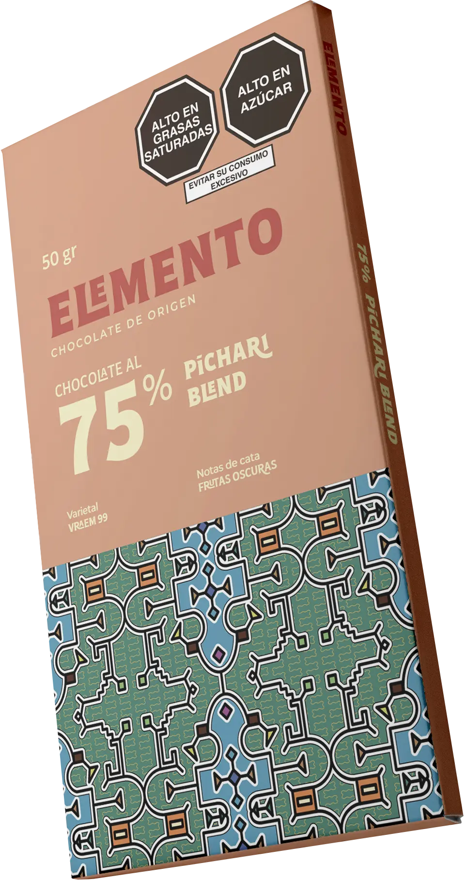 Origen: Pichari, Perú. 75% de cacao; endulzante: azúcar de caña. Presentación: 50 g neto / 88 g bruto. Medidas del empaque: 16 cm x 9 cm x 0.6 cm. Notas de cata: frutas oscuras. Ingredientes: cacao, manteca de cacao y azúcar. Usos: consumo directo.